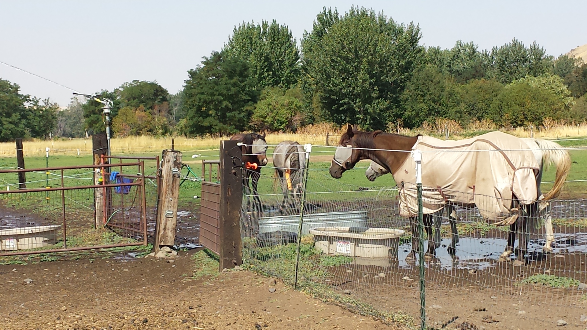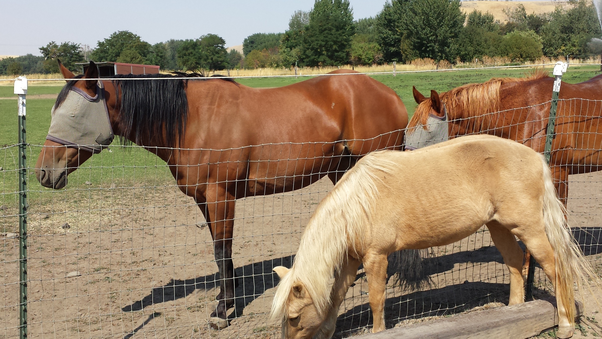 Derby the palomino puts up with Wryly (aka Dennis the Menace) the Arabian. Both are wearing top-of-the-line SmartPak blankets.